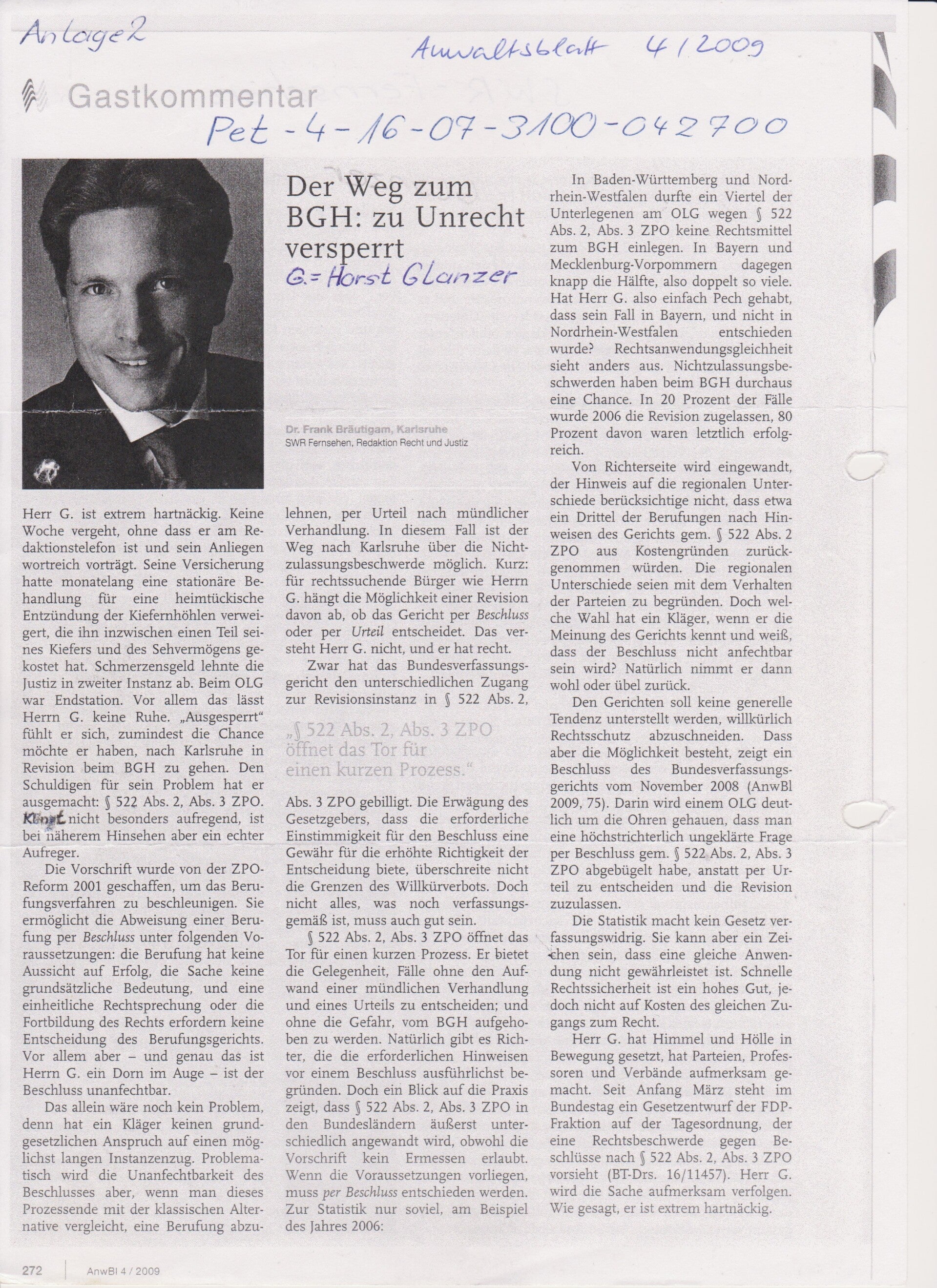 " Zu Unrecht wurde ich bei Gericht ausgesperrt " durch den " Aussperrparagrafen, " nämlich durch den Paragrafen 522 Absatz 2 und 3 ZPO a. F., der auch " kein weiteres Rechtsmittel mehr zugelassen hatte " zum Bundesgerichtshof in Karlsruhe, weil der Absatz 3 das weitere Rechtsmittel nicht mehr zugelassen hatte, durch die " völlig überflüssige und auch hirnrissige Rechtsmittelbeschneidung " im Jahre 2002 der damaligen ROT - GRÜNEN - Bundesregierung in Berlin, und dies wurde mir am 28. Februar 2008 zum " Verhängnis " beim 8. Zivilsenat beim Oberlandesgericht in Nürnberg, als die 3 Richter mich persönlich " ohne mündliche Verhandlung bei Gericht ausgesperrt hatten ohne mein rechtliches Gehör zu bekommen, und somit war mein Weg zum Bundesgerichtshof in Karlsruhe vorsätzlich willkürlich rigoros menschenrechtsverletzend ohne Rücksicht auf Verluste versperrt gewesen, " und dadurch hatte ich meine " komplette Existenz verloren wegen 3 Rechtsbeuger, " denen bis dato heute " absolut ganz und gar nichts passiert ist, " und der noch jetzige Ministerpräsident Herr Dr. Markus Söder " schützt auch noch diese 3 Rechtsbeuger, " die sogar in seinem Wahlkreis sind, und darum kümmert sich auch der Bayerische Ministerpräsident Herr Dr. Markus Söder " absolut nicht " um meinen " JAHRHUNDERT - JUSTIZSKANDAL " ???
